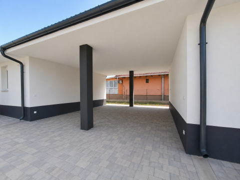 A házhoz tartozik egy 18 nm-es fedett gépkocsibeálló, így a kényelmes parkolási lehetőség biztosított. A telek nyeles kialakítású, osztatlan közös tulajdon, a használati megosztás szerinti telekrész 459 nm. A tulajdonviszonyok ügyvédi megosztással rendezettek lesznek. A bejutás elektromos kapun keresztül történik.